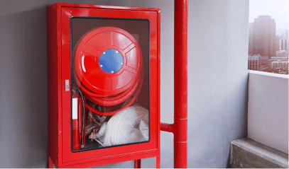 Manually operated hose system for initial firefighting efforts in corridors and industrial zones.